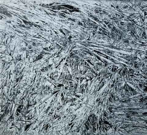 Monochrome and near-monochrome studies in texture and rhythm. Dense, directional marks evoke frost formations, frozen grass, or ice seen from above — natural patterns that emerge without intention, shaped by temperature and wind. Stripped of the color complexity found in other series, these works focus attention on surface and movement. The layered technique remains, but serves observation rather than concept — a quiet counterpoint to the saturated world.